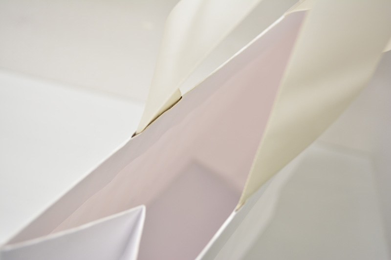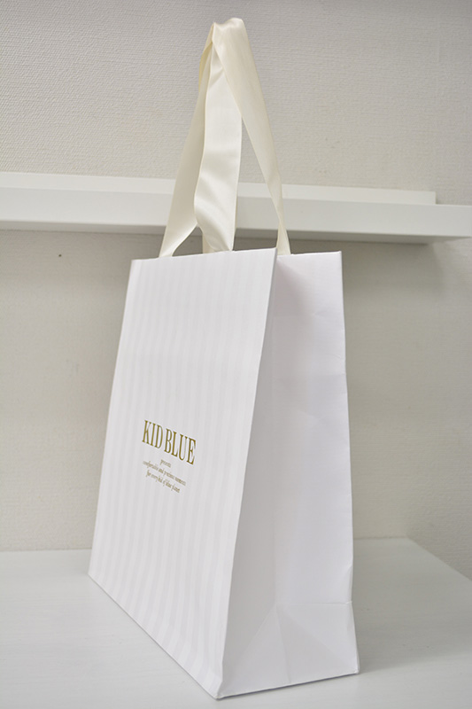繊細なストライプが美しい紙袋2013年12月13日 こんにちはベリービーの芦谷です。 今日はとても繊細なストライプが美しい紙袋をご紹介します。 画像ではとても見えにくいのですが うっすらとパープルのストライプが印刷されています。 寄ってみると少しわかりやすくなります。 ロゴマークはゴールドで印刷され、 表面全体にはジャガードのエンボスがプレスされています。 全体の繊細なイメージを高めるような サテンリボンの縦留め仕様。 儚げで美しいバランスの紙袋です。