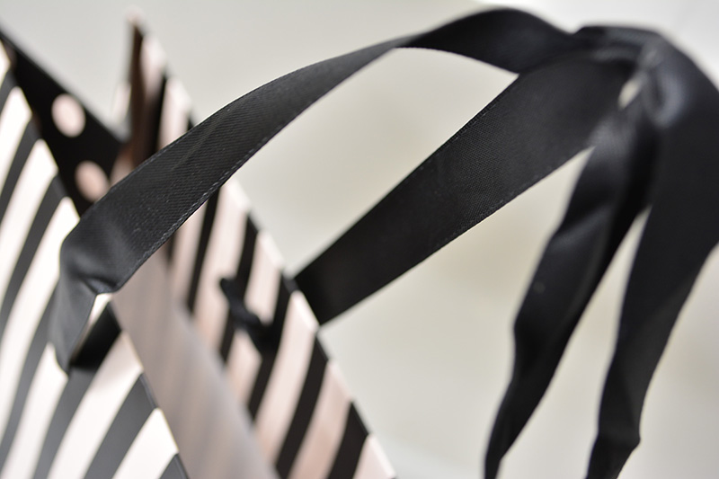 またまた、今日もストライプ紙袋2013年12月14日 こんにちはベリービーの芦谷です。 本日も昨日に引き続き、しましま紙袋をご紹介します。 今日、ご紹介するのは先日とは趣向の違った力強いストライプ紙袋です。 存在感ある黒いストライプの紙袋です。 側面にはドットのデザイン。 ロゴマークを縁取っているクラシカルなデザインも女性に大人気なパターンです。 ハンドルにはサテンリボンを使用。 女性に人気のパターンをぎゅーっと凝縮した紙袋ですね。