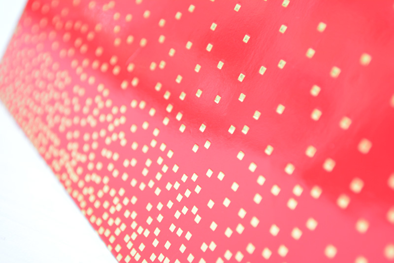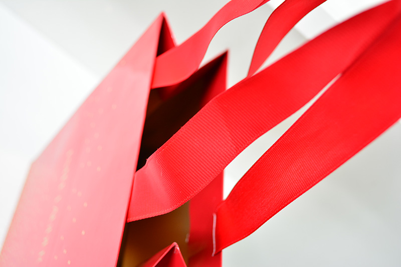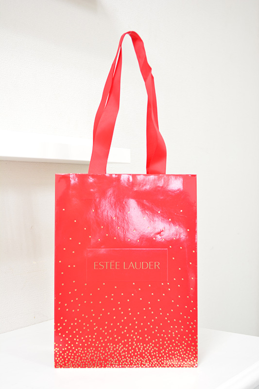 とってもクリスマスな紙袋2013年12月16日 こんにちはベリービーの芦谷です。 もうすぐクリスマスですね! そんなシーズンにピッタリの紙袋をご紹介します。 上品なレッドに金色の雪を散りばめたようなデザインです。 ロゴマークと金色のチップは浮き出し箔のように見えますが ベースに金色の蒸着紙を使用し、 上から赤色を印刷して金色を浮き立たせています。 ハンドルには真っ赤なグログランテープを使用。 縦留めですっきり取り付けられています。 内面にもゴールドの蒸着処理がされています。 とてもクリスマスらしい、ゴージャスな紙袋です!