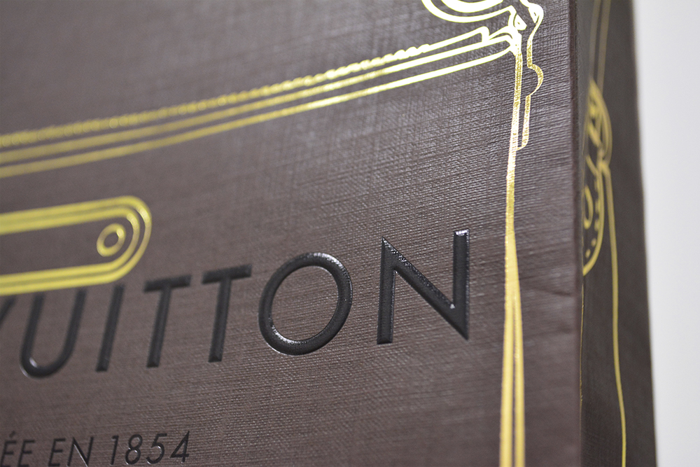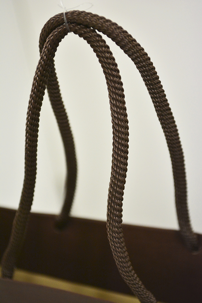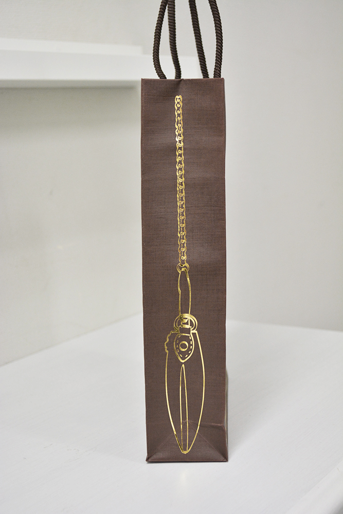 大型箔でイメージが変わるスペシャルな紙袋2014年01月21日 こんにちは。 ベリービーの加茂です。 今日は説明無用のこの紙袋。 いつもと同じ紙にロゴが浮き出しの箔押しで入っています。 そして何かのイベント用なのでしょうか。 正面の全体にクラッチバッグの箔押しが入っています。 マチにもバッグの側面が入っています。 しかし正面、側面ともに大きな箔押しですね〜 アップで見てみると箔押し、浮き出し、エンボスと トリプルコンボです。 紐の素材はPPですが、高級感がありますよね。 いつもと同じ紙袋だからこそ、 箔押しが入って逆に特別感がでていますね!