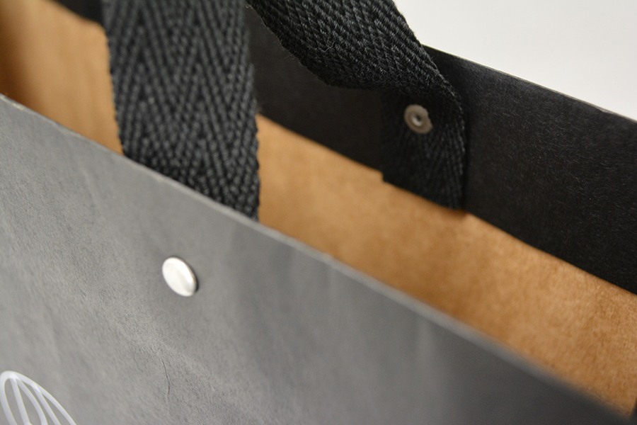 ユースフルでカジュアルな紙袋2014年03月05日 こんにちは、ベリービーの高橋です。 今日は、男性的でカジュアルな紙袋をご紹介します。 全体的に、ブラックです。 ロゴはホワイトのインクで印刷しております。 ハンドルは、少し厚めの丈夫な平紐です。 紐留め部分にリベットを使用しています。 内面は、印刷なしで未晒クラフトとなっていますが 表面も未晒クラフト(茶色)にブラックを印刷したものに なっております。 クラフト紙を使用し、カジュアルに決まっていますね。 ブラックの印刷も落ち着きを感じさせ 持ち歩くにも、丁度良いように思います。