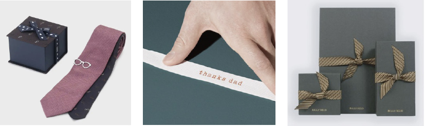 左図の「TAKEO KIKUCHI」のように、父の日らしいハットのモチーフをシルク印刷で施したデザインや、シンプルなメッセージを箔印刷した「BVLGARI」のスタイルは定番です。また、右図の「BILLY REID」のように、転写印刷を使用して全面にデザインを施すスタイルは、フォーマル感があり、父の日にぴったりの仕様です。