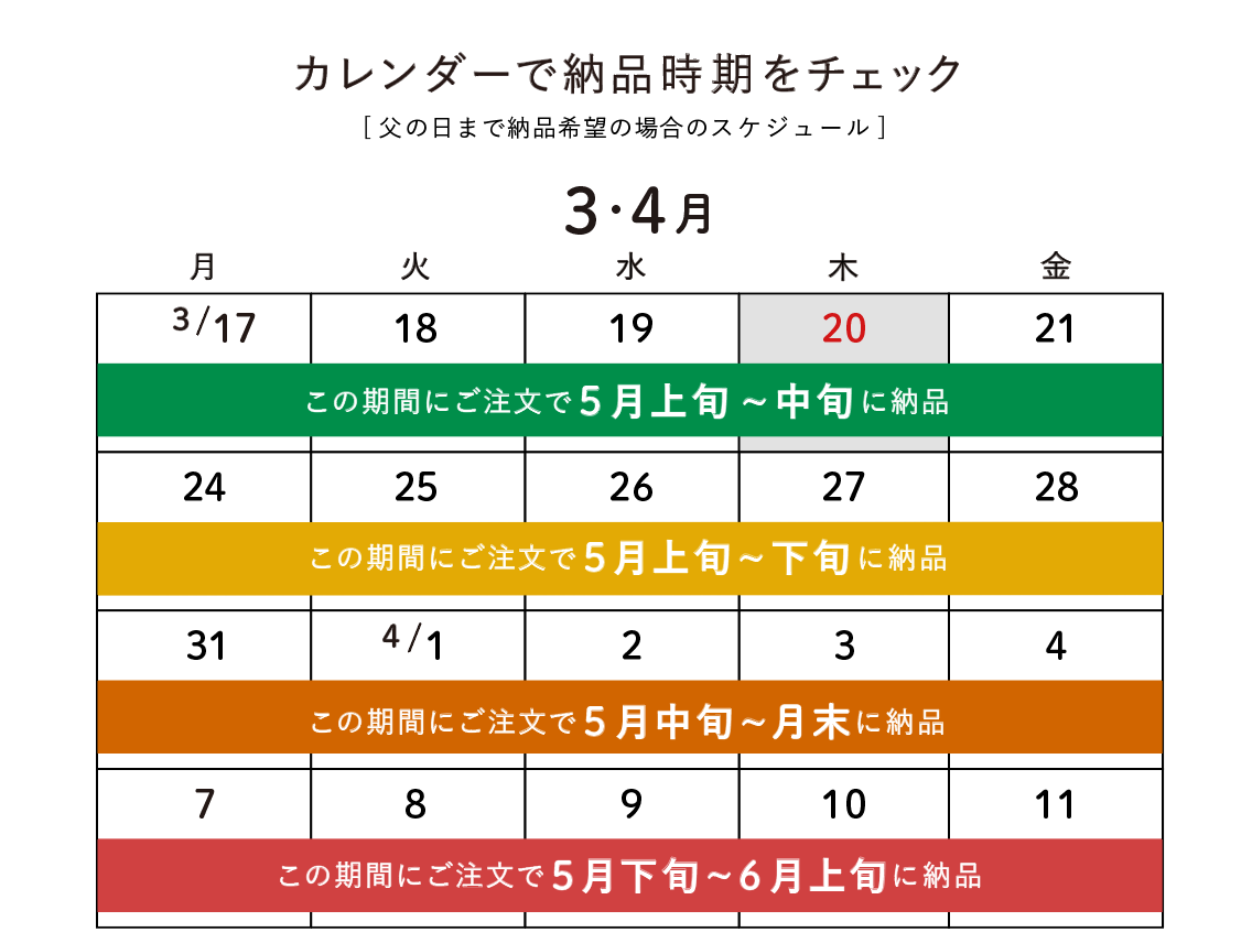 発注時期ごとの納品スケジュールをカレンダーにまとめていますので、ご希望の時期に合わせて早めの発注をご検討ください。父の日まで納品をご希望のお客様は、余裕をもって4月初旬までのご発注をおすすめいたします。
