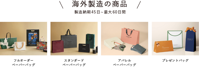 上記の商品は、通常納期が45日程度となっておりますが、ベリービーのオリジナル紙袋は受注生産のため、仕様やデザインはお客様ごとに異なりますので、製造期間もそれぞれ異なる場合がございます。ご使用日がお決まりの場 合はスタッフまでお気軽にご相談ください。