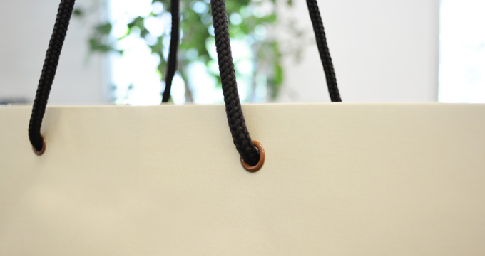 ハンドル部分を強化する方法のひとつが「ハトメ加工」です。聞きなれない人も多いと思いますが、これは紐を通す穴の部分を金属の部品で強化する加工のこと。大型バッグなどでよく見かけますね。特大紙袋ともなると、中身に加えて紙バッグ自体の重さもハンドルの紐穴部分にかかってきます。穴がちぎれてハンドルで持ち運べなくなると、紙バッグの寿命が早々に終わってしまいます。ハトメ加工は大型紙袋を作る際には、ぜひ取り入れたい加工の1つですね。