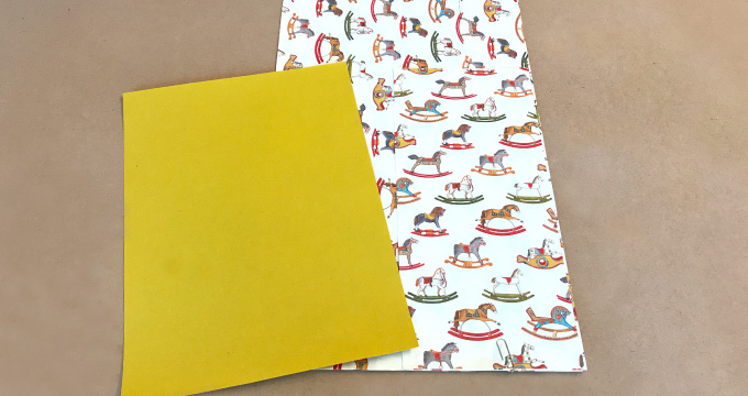 私が今回選んだのは、この紙。表面には木馬柄の紙を、中面には渋めの黄色い紙を選びました。木馬柄の紙はイタリア産、黄色は日本の紙だそうです。