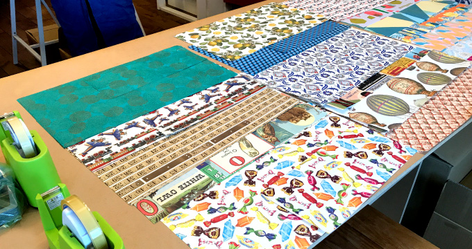 私が今回参加したワークショップは、大きめサイズの持ち手つきの収納ボックスを作る回です。まず、箱に使いたい紙をこの並べられた紙の中から選びます。