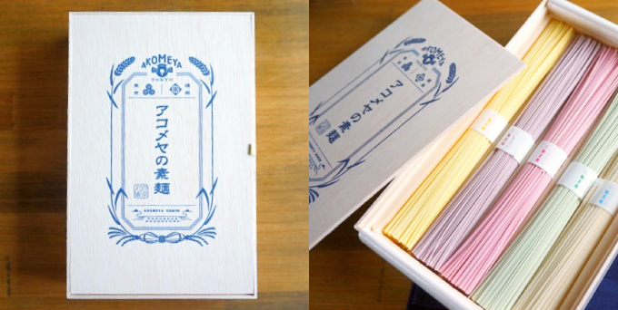 カラフルな素麺のパッケージ。木箱に入った素麺は特別感満載ですね。