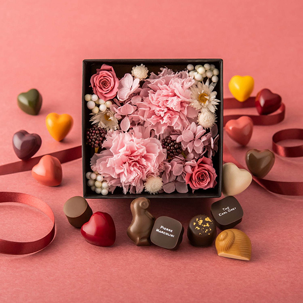 ピエール・マルコリーニのチョコレートギフトはプリザーブドフラワーと組み合わせています。