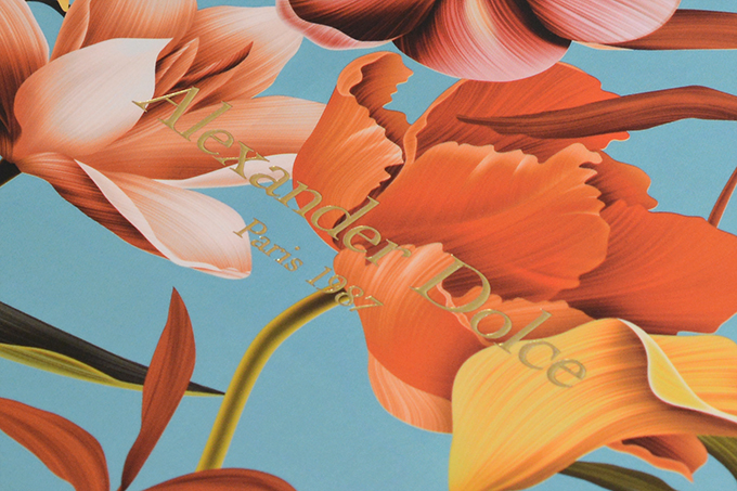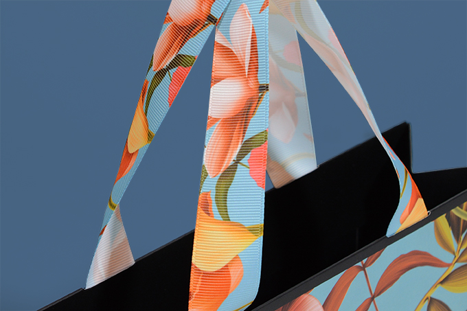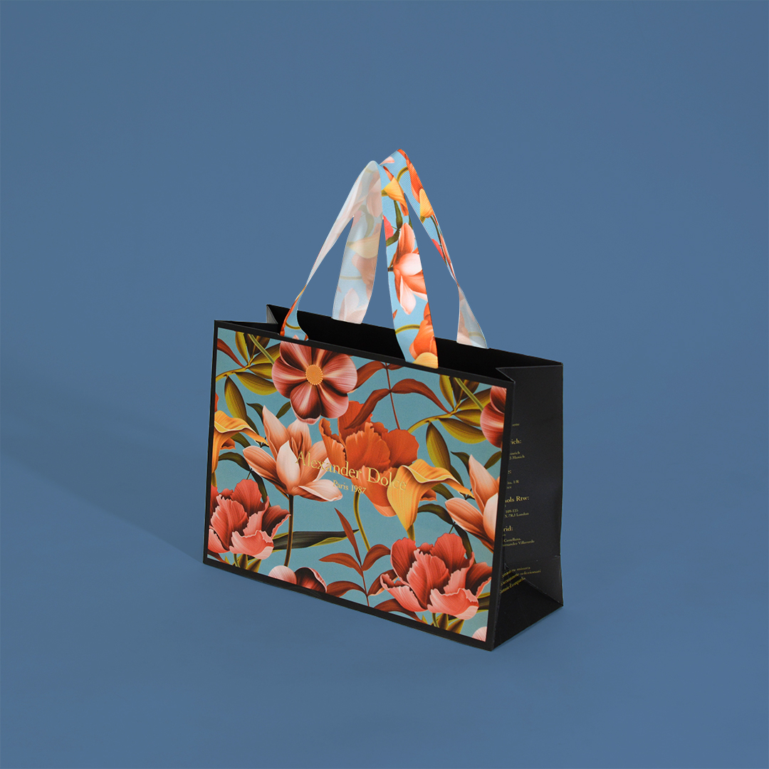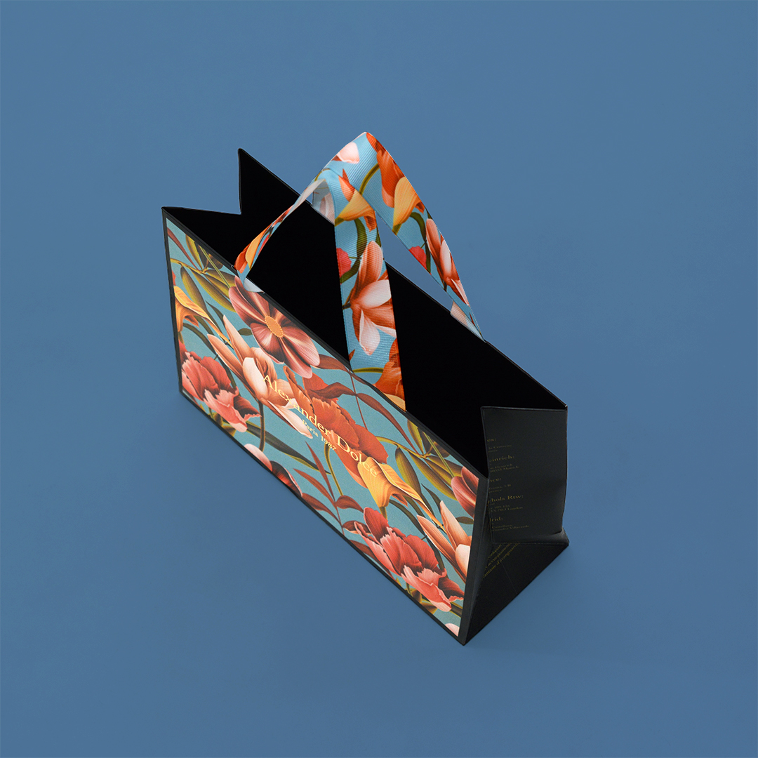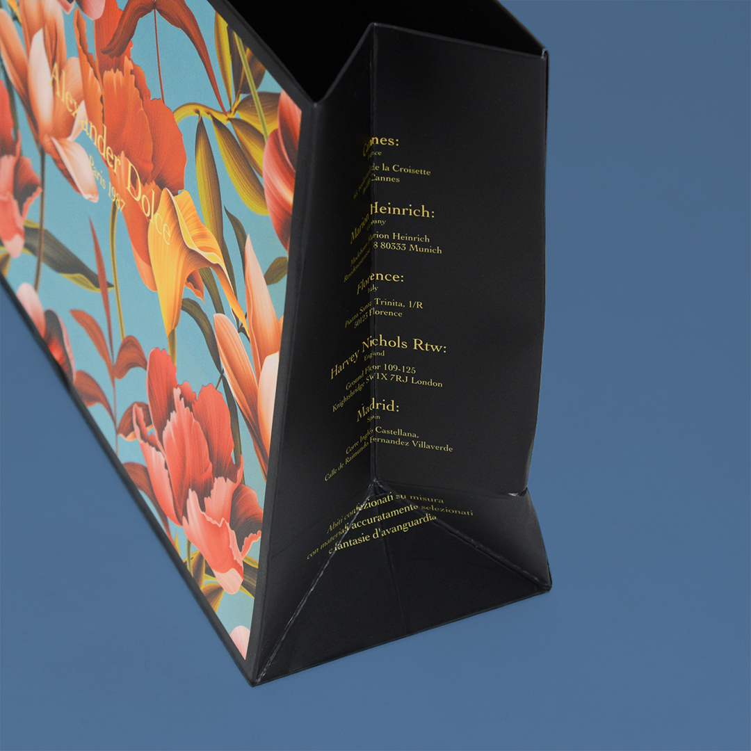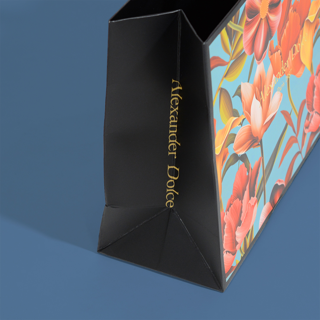 紙袋のマチや内面も黒色で統一することでインパクトのある花柄をより一層引き締めています。
