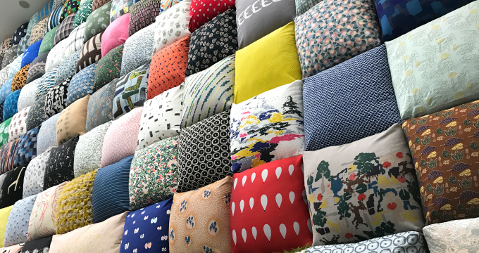 オリジナルの図案による生地を作るところからはじまり、その生地を使った衣服や家具のほか、