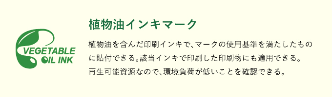 このマークが入っていることで、植物油を利用したインクを使った環境配慮の印刷物ということが伝わります。