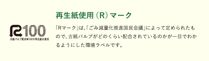 上の再生紙使用マークは、見たとおりに古紙パルプ配合率が100%という意味です。