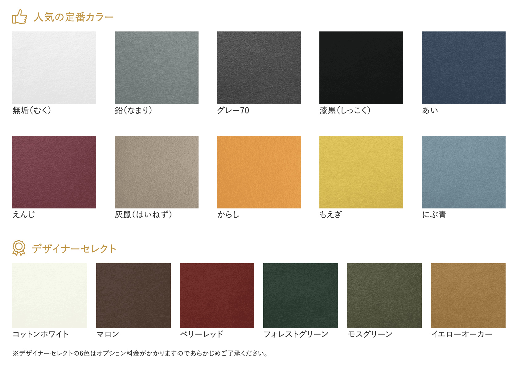 ※デザイナーセレクトの6色はオプション料金がかかりますのであらかじめご了承ください。